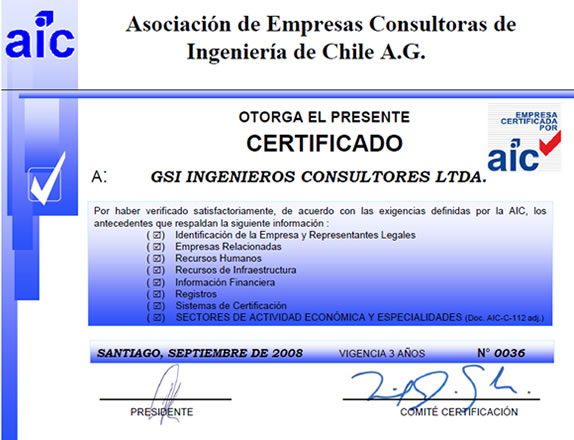 Con el propósito de perfeccionar el servicio que actualmente proporciona la empresa, orientado al mejoramiento continuo y a la satisfacción de sus clientes, GSI está certificada segun se detalla a continuación e inscrita en los Registros de Consultores más importantes del país, en las categorías superiores de sus especialidades.